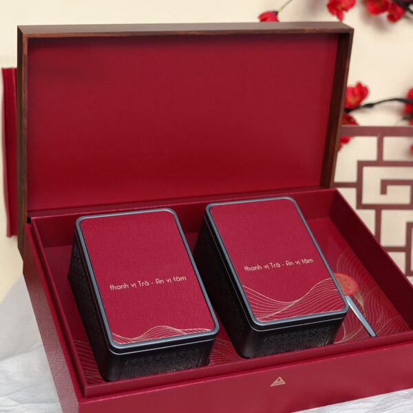 Hộp quà: Làm từ gỗ Đài Loan cao cấp, thiết kế tỉ mỉ, mang đậm nét truyền thống nhưng vẫn hiện đại, sang trọng.